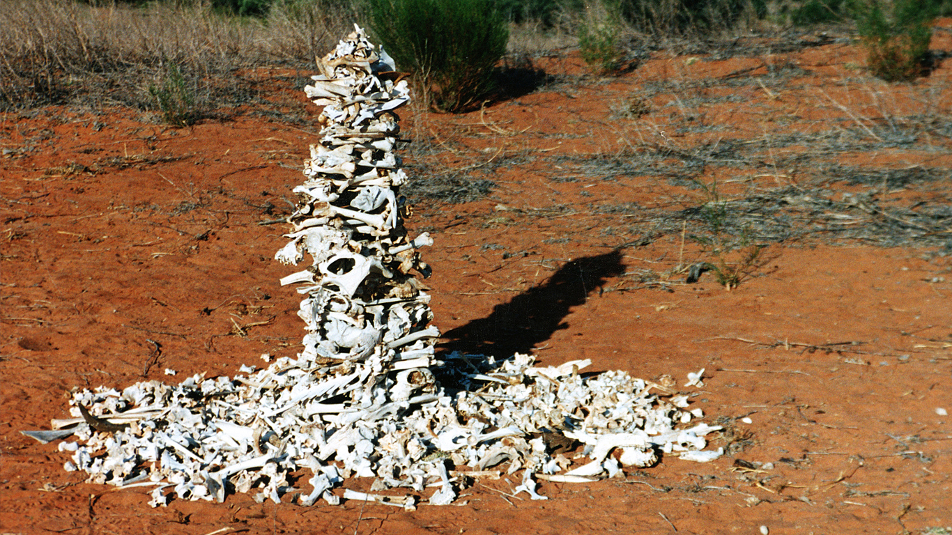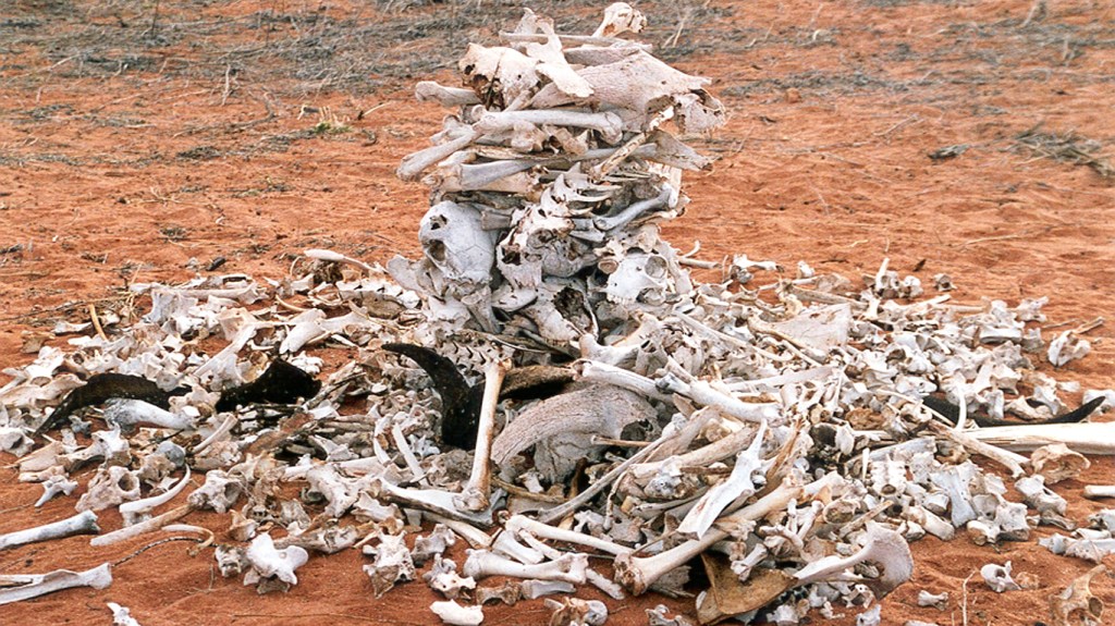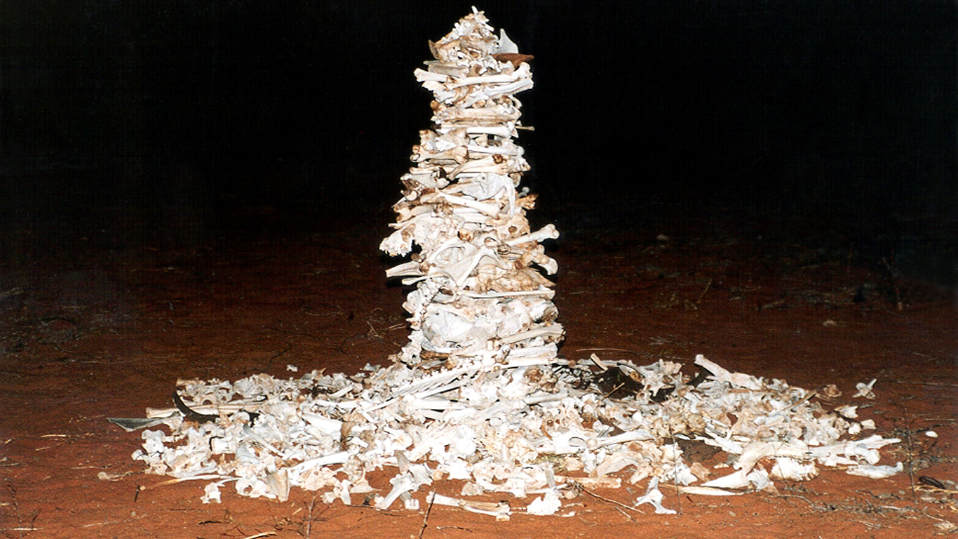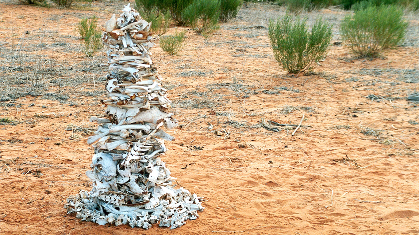 The work was both tentative and responsive. After an initial collapse, the column was rebuilt, and its presence softened by a circle of remaining bones at its base—an attempt to ground the vertical form within the vast horizontality of the open plain. At night, under the full moon, the structure gave off a pale, spectral glow, the bones resonating in the landscape with a quiet, primal weight. In those moments, the work felt both deeply still and strangely alive.