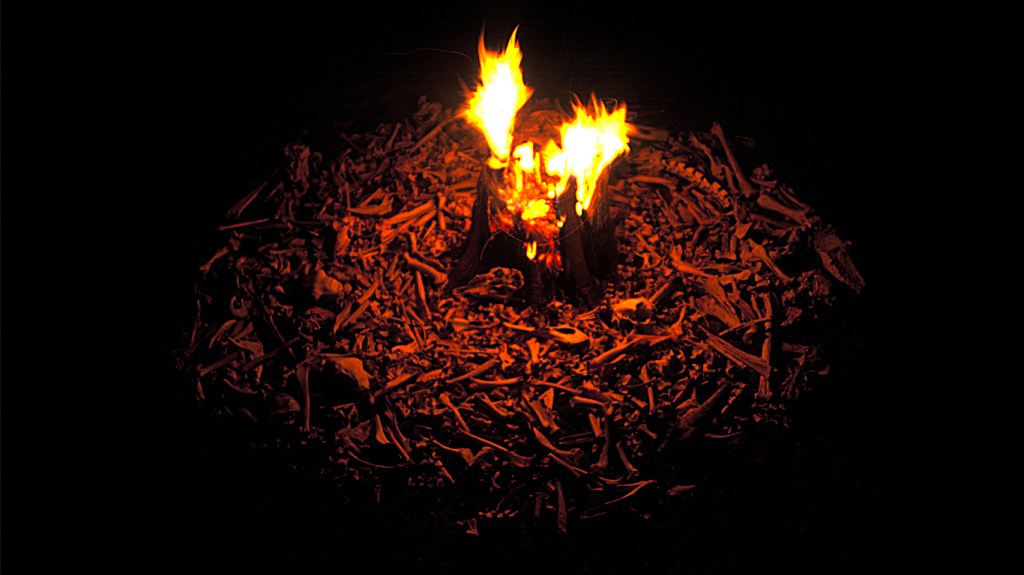 This phase also carried an intentional act of auto-documentation. Unlike many works where recording is a separate, secondary process, here the creation of a remnant record was woven into the work itself. Beneath the bones, at the four cardinal points, unexposed photographic paper had been placed. When the fire was kindled, its glow directly imprinted the bones’ shadows onto the paper – a delicate photogram capturing the ephemeral encounter between light, material, and place.