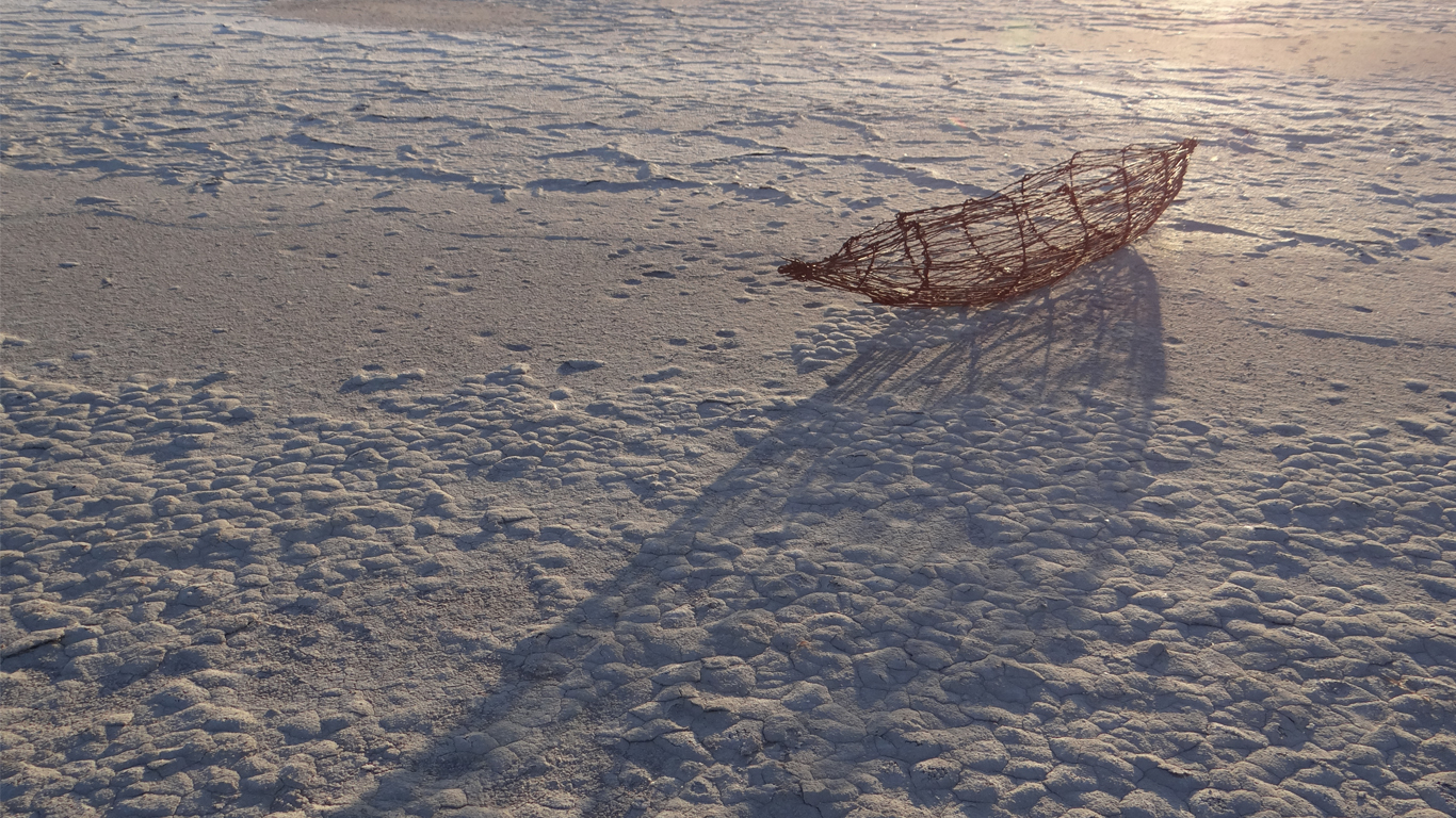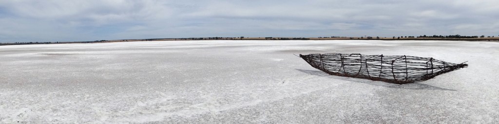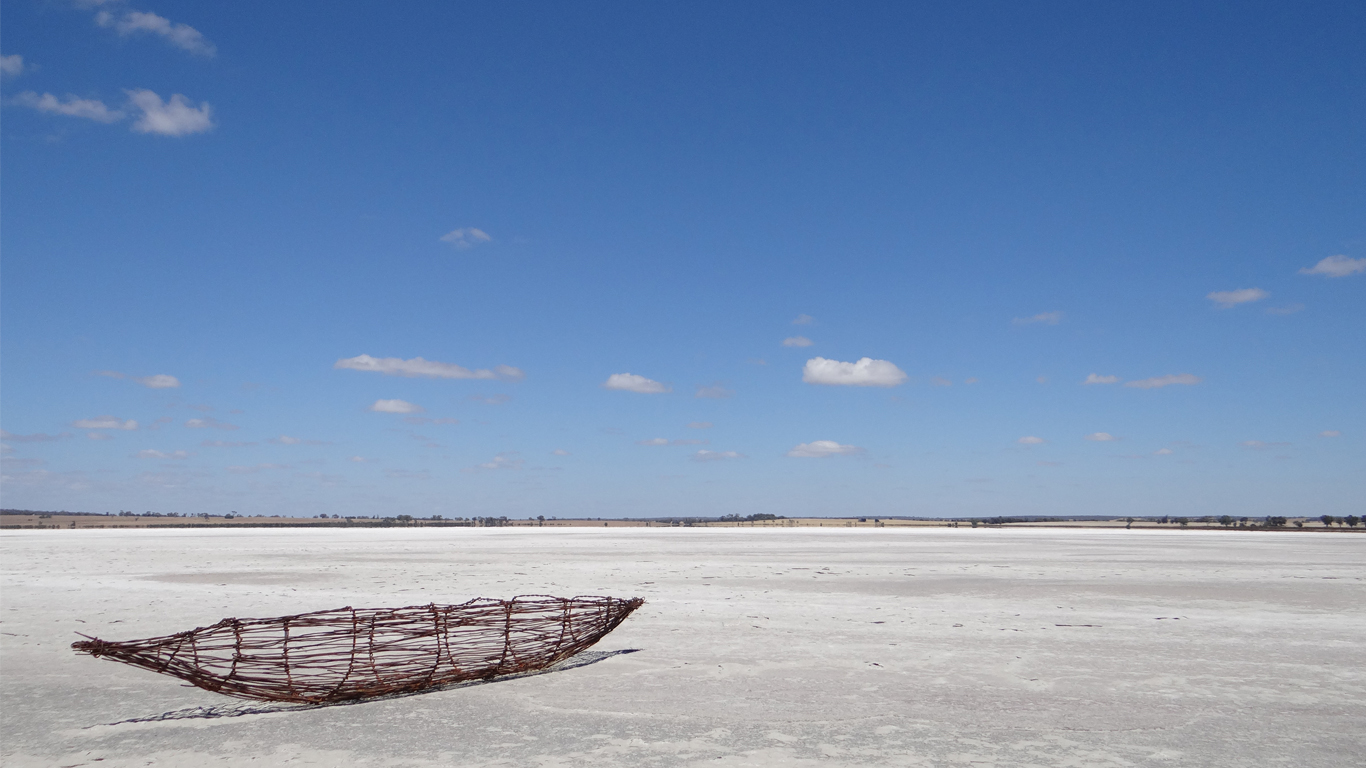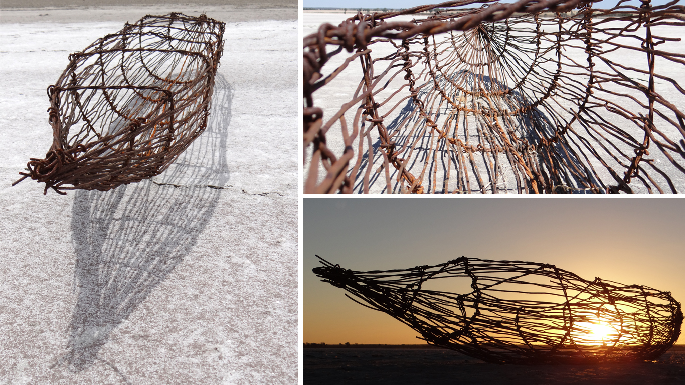 This work rests on Mitre Lake near Natimuk, Australia. Mitre Lake is a salt lake located in north western Victoria. The high salinity environment will slowly consume the artwork by rusting the wire body away with time.