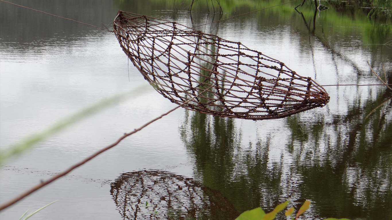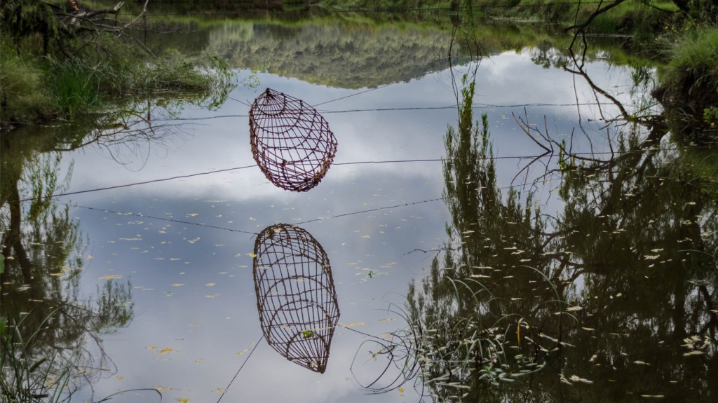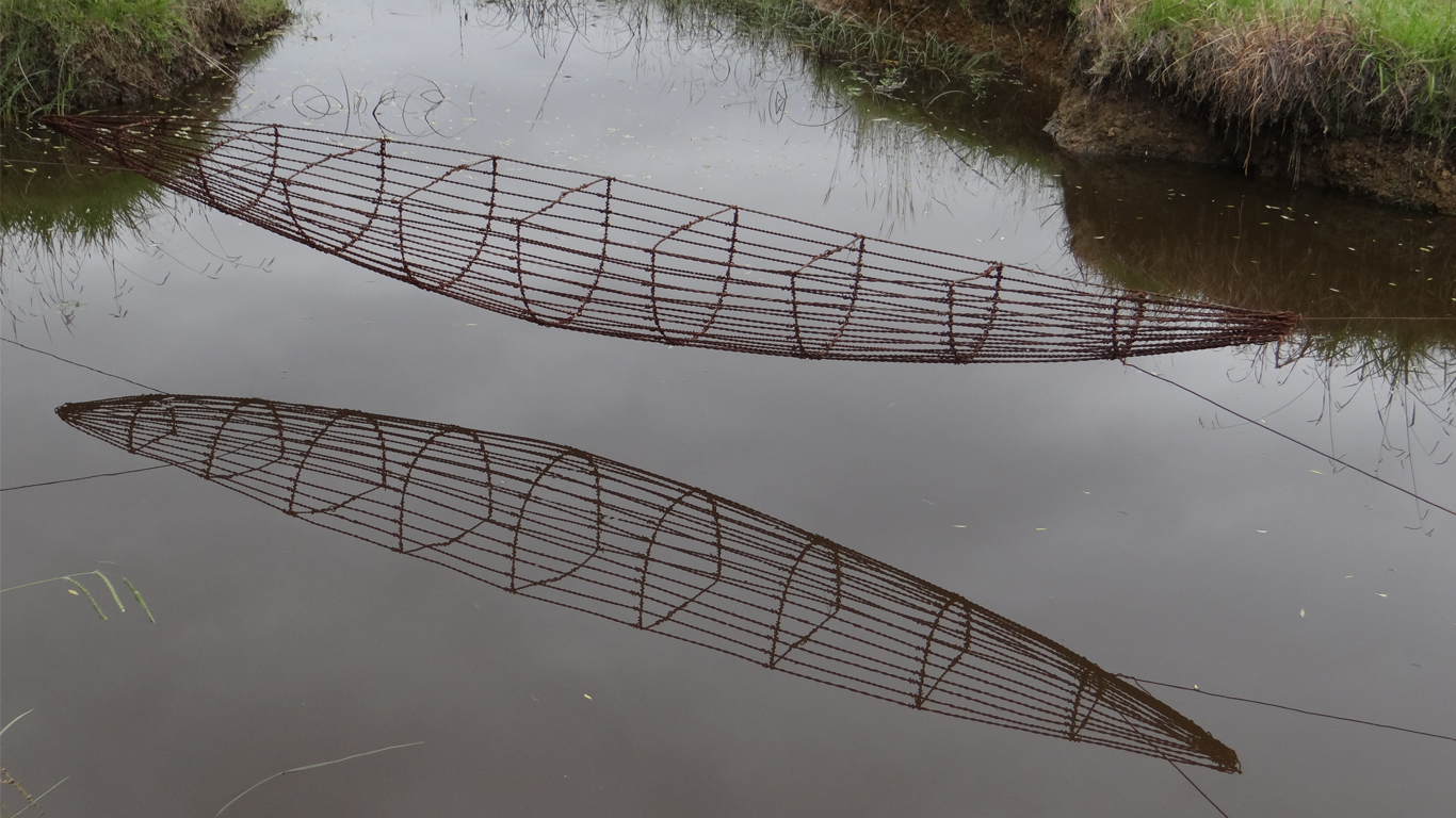 In this piece the vessel sits in space, balanced by counterweighted stones sourced onsite.