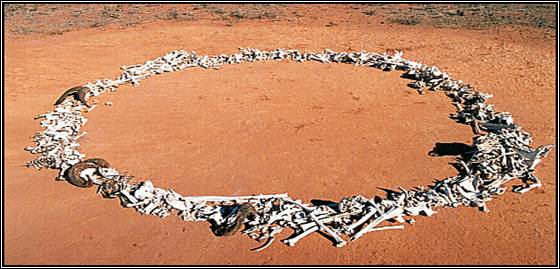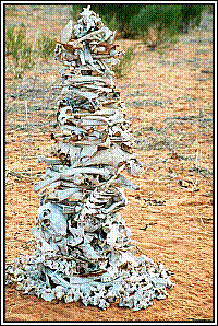 Following a process that has almost become a ritualised method I walked within a small area surrounding the site, (approximately 200 meters radius) and collected my materials. By creating this specificity of site and material collection, I am forming a spiritual demarcation of space. Although the work interacts with the land at large, due to the environment’s nature of continuity, it is only the immediacy of that small site that I am truly responding to. Within this small area I collected the sun-bleached bones of animal skeletons, as they seemed indicative of the harshness and aridity of this place. Using these materials I began to build a fragile column like structure that reached skyward. Beginning from the basic concept of the shelter I made the column hollow, which also meant that the work was more fragile and susceptible to environmental conditions. I felt that the fragility was a vital element to the honesty of the work. With this work being inspired by the fleeting, dynamic spirit of natural processes it would then feel fraudulent to create works that were dense and long-lived. After a failure during the initial attempt, the column was completed, as can be seen in figure 1. The problem then was that the column seemed like a disparate element within the space. Using the remaining bone material I encircled the base of the column to help ground it and tie it to the vast horizontalness of this environment.