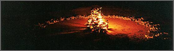 At night the creative process of the work could enter its next phase. I then created a cairn-like column in the center of the circle. This bone column was constructed over a fire that had been built but not lit. Once the column was complete it glowed under the light of the full moon. I then lit the fire, as can be seen below in figure 7.
